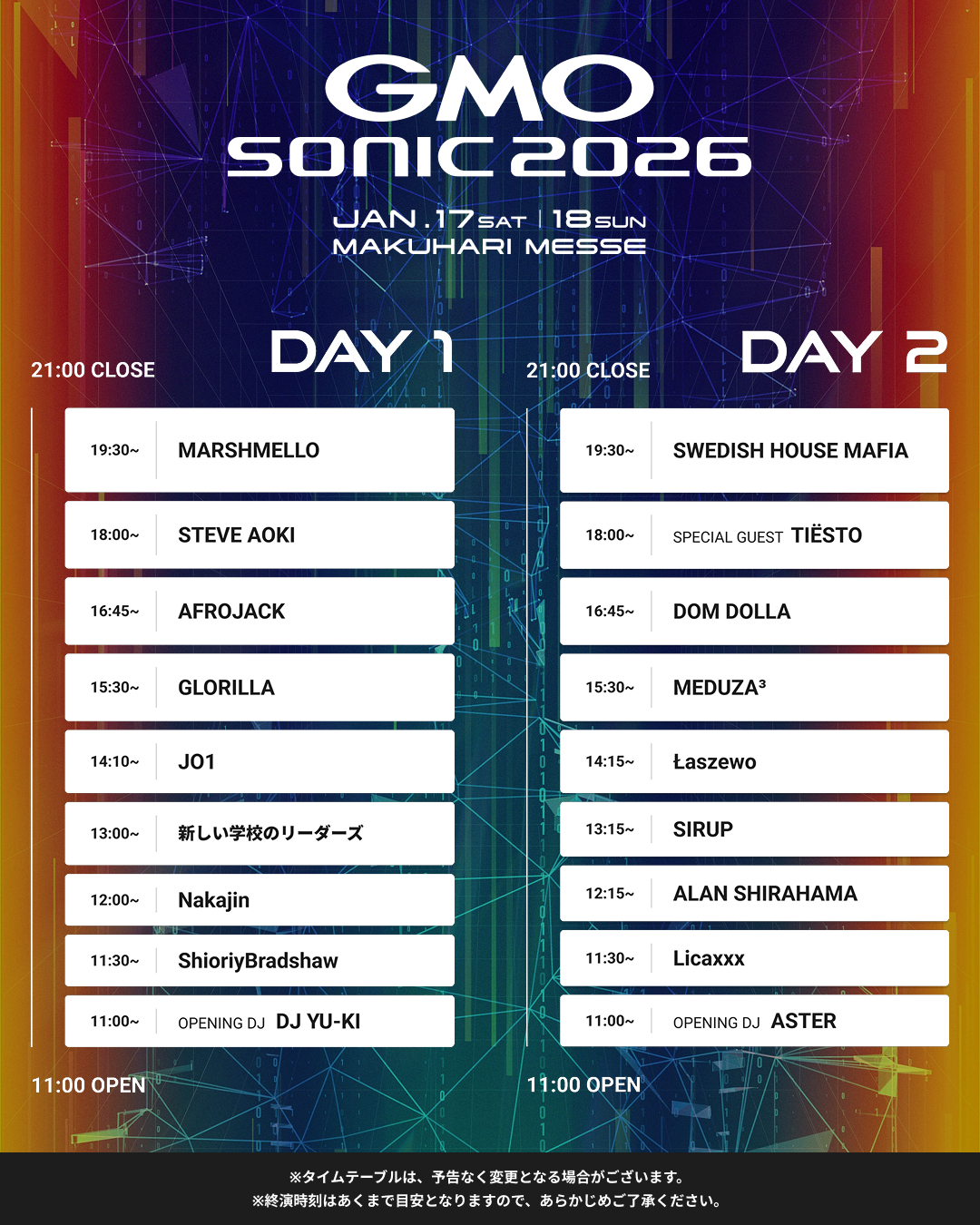 🎪GMO SONIC 2026 タイムテーブル発表!!🎪 最高の2日間がいよいよ始まる!✨ まだチケットをお持ちでない方はお早めに💨