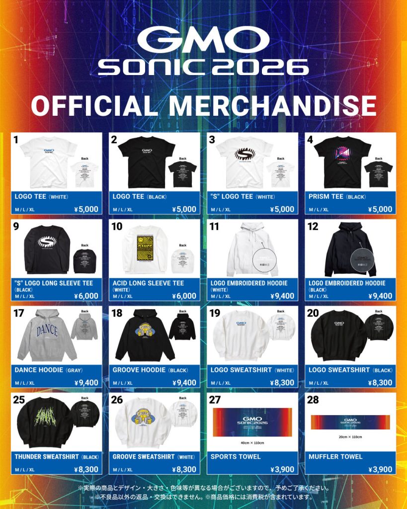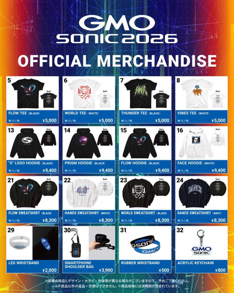 GMO SONIC 2026では、両日オフィシャルグッズと以下のアーティストグッズを販売いたします。